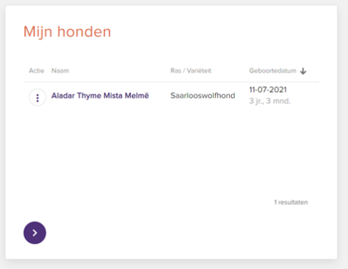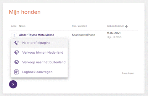 Zoals je ziet zijn er voor de naam van de hond drie puntjes zichtbaar. Hier kun je op klikken. Dat zorgt voor een keuzemenu. Het is de eerste optie die je moet hebben, dus “Naar profielpagina”.