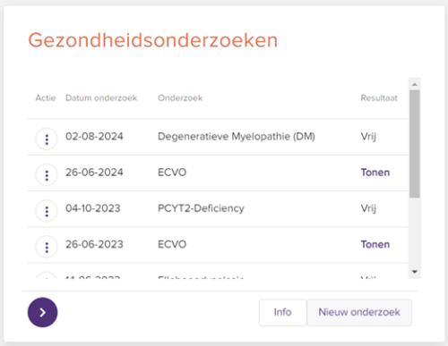 Er opent een nieuwe pagina met het profiel van de hond. Hier vind je de Algemene gegevens, Gezondheidsonderzoeken, Nesten, DNA, Titels/Showresultaten, Afstamming en Documenten. Je raadt het misschien al. Je moet de Gezondheidsonderzoeken hebben. Hier kun je zien welke onderzoeken al bekend zijn bij de Raad van Beheer. Ook is dit de plek waar je zelf onderzoeken toe kunt voegen.