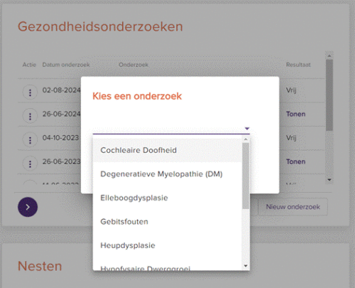 Wanneer je op deze optie hebt geklikt, krijg je gelijk een pop-up in je scherm die aan jou vraagt welk onderzoek je toe wilt voegen. Klik je op het pijltje rechts naast het lijntje, opent er een drop-down menu met alle testen die je voor de Saarlooswolfhond toe kunt voegen. Hier kies je welke test je toe gaat voegen.