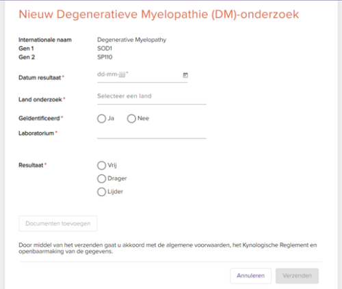 Wanneer je gekozen hebt welk onderzoek je toe wilt voegen, klik je op bevestigen. Ik heb als voorbeeld even DM gepakt. Er opent wederom een nieuw scherm. Hier vul je de gegevens in die gevraagd worden. Houd rekening met de nieuwe regels omtrent het afnemen van DNA voor onderzoeken. In afbeelding 5 zie je wat er gevraagd wordt. Ook moet je natuurlijk het onderzoek zelf toevoegen. Dit kan door het onderzoek als Pdf-bestand toe te uploaden. Alles compleet? Dan kun je het verzenden!